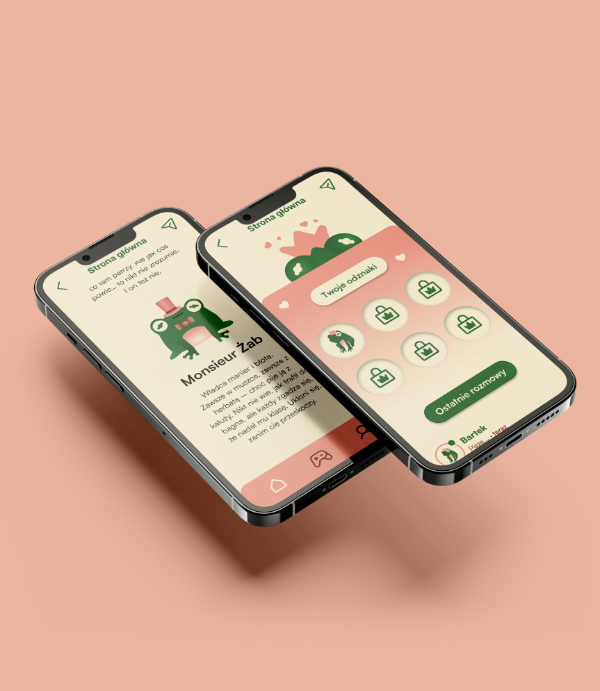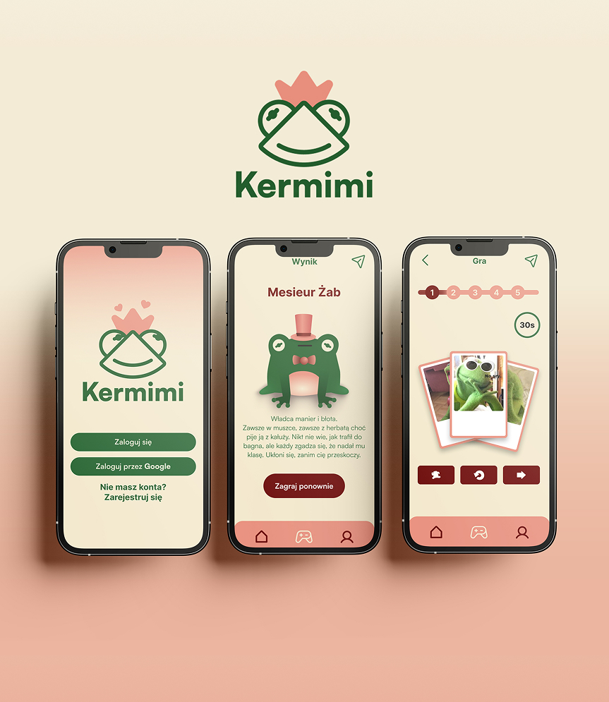Kermimi to koncepcyjna aplikacja randkowa oparta na memach i lekkim podejściu do relacji. Na start użytkownik przechodzi quiz osobowości, który przypisuje mu jedną z odznak, na przykład „Leniwy Król Chaosu” albo „Perfekcyjna Pani Sarkazmu”. Odznaki pomagają dopasować osoby o podobnej energii i stylu komunikacji. Po kliknięciu ikony gry aplikacja automatycznie dobiera drugiego gracza na podstawie ich odznak i rozpoczyna rozgrywkę. Gra składa się z kilku szybkich etapów, każdy z nich trwa 30 sekund, po których aplikacja automatycznie przechodzi dalej, nawet jeśli gracz nie zdąży. Najpierw losowane są trzy szablony z klasycznymi memami Kermita, które można przetasować. Następnie dodaje się podpisy do obrazków, tworząc własne karty. W kolejnym etapie gracze nawzajem oceniają swoje memy, klikając „like” lub „unlike”. Na tej podstawie aplikacja wylicza procent dopasowania, na przykład „70% super chemia!”. Po zakończeniu rozgrywki można rozpocząć czat z osobą, z którą się grało, zainicjować nową grę (z automatycznie dobranym innym graczem) albo po prostu wrócić na ekran główny. Do ekranu głównego można też przejść w każdej chwili podczas rozgrywki, jeśli gracz zdecyduje się zakończyć ją wcześniej. Na ekranie głównym widoczne są zdobyte odznaki, ostatnie rozmowy oraz krótkie opisy wszystkich typów osobowości. Kermimi nie traktuje randek śmiertelnie poważnie, to przestrzeń, w której wszystko zaczyna się od wspólnego poczucia humoru i żabiego vibe’u.